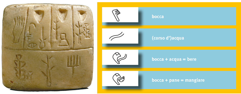 Questa tavoletta contiene pittogrammi che rappresentano immagini di oggetti riconoscibili: per esempio, il disegno di una pecora indicava una pecora, il disegno di un pesce indicava un pesce. I pittogrammi divennero migliaia, anche se potevano essere associati l’uno all’altro: il pittogramma indicante la bocca, unito a quello indicante l’acqua, esprimeva il bere. E se al segno indicante l’acqua si sostituiva il pittogramma del pane, si esprimeva il mangiare.