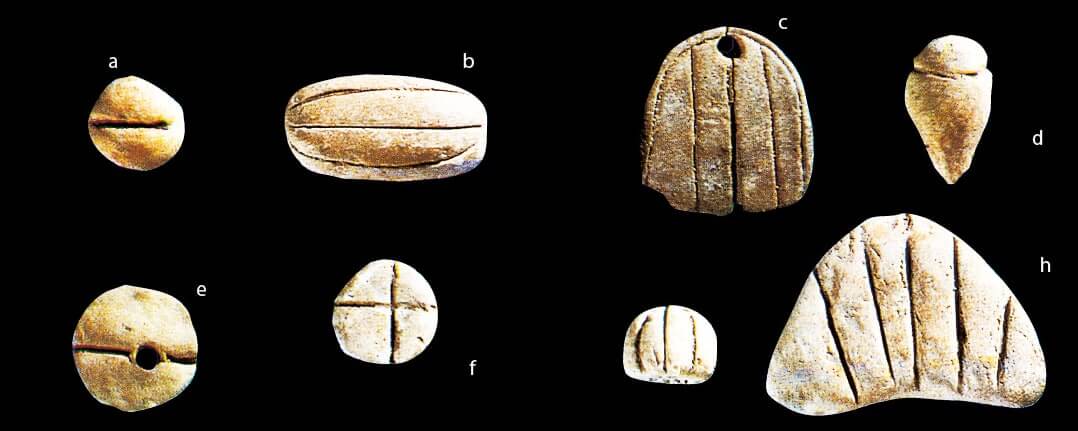 Uno dei primi passi verso l’invenzione della scrittura è dettato dalla necessità dell’uomo di trasmettere informazioni precise. Secondo alcuni studiosi, all’origine della tecnica della scrittura ci sarebbe l’uso dei contrassegni che identificavano e sigillavano i vasi, i sacchi o gli stessi magazzini. Erano piccoli gettoni di conto, fatti di argilla di forma diversa (dischi, sfere, cilindri, coni, triangoli, ecc.), ognuno dei quali indicava una determinata quantità di un certo bene: per esempio una giara, dieci contenitori di birra, sessanta pecore, e così via: a. Unità di terra; b. Lingotto di metallo; c. Pecora; d. Giara di olio; e. Tessuto; f. Veste; g. Non identificato; h. Corda.
